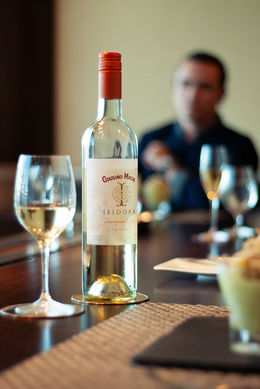 Como main plate, un magret de pato con una salsa de sauco de Tecpán, una reducción de vino tinto con frutos rojos, acompañados de unas papitas rissole clásicas francesas con matequilla, espárragos a la parrilla, marinado con un salentein merlot, 12 meses de barrica en roble francés nuevo, proveniente del Valle de Uco, Argentina.